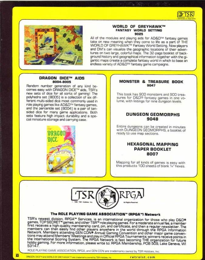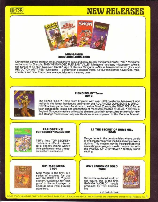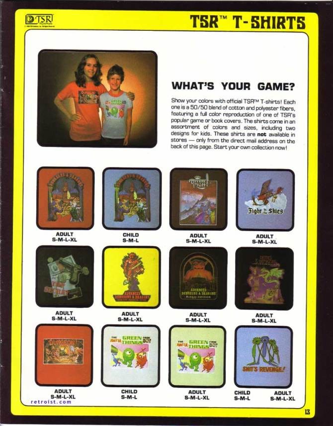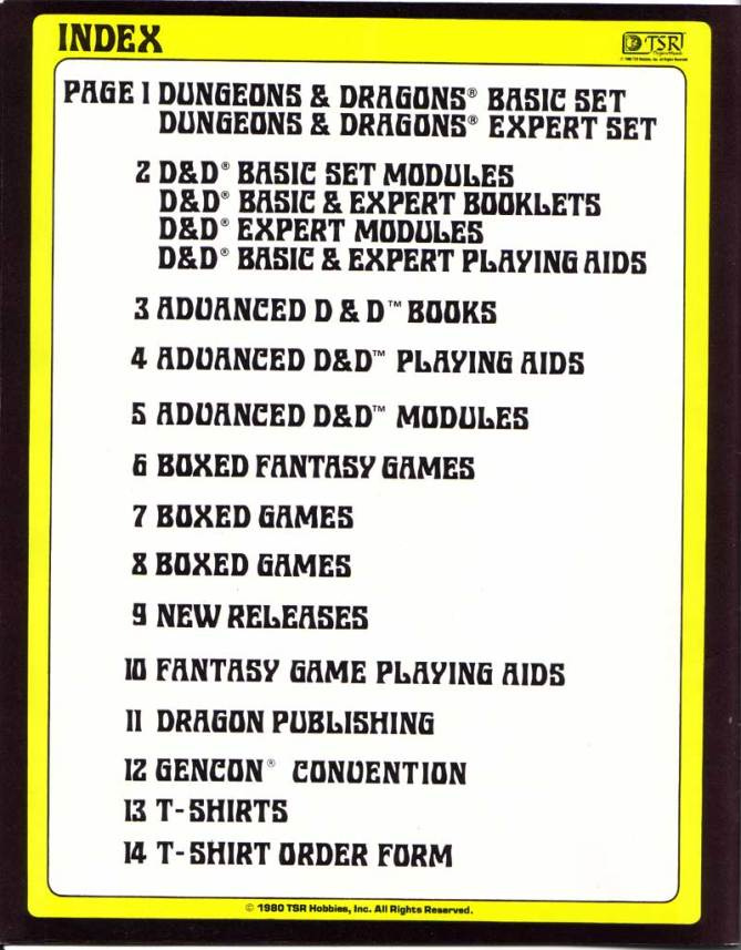 I was going through the boxes the other day, taking inventory and dreaming of playing, when I found this old catalog. It’s the sum of what the granddaddy of role playing, TSR, had to offer in 1980/1981, and it needed to be shared. It is awesome.