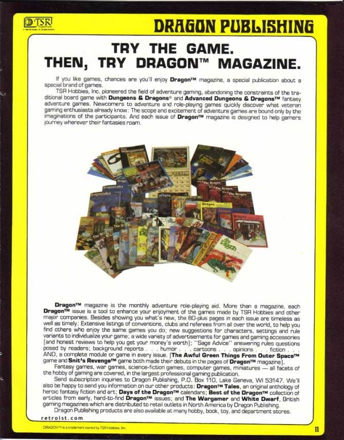 LOVE Dragon Magazine. It was always filled with thought-provoking articles and gave you a sense of community. For my money, though, Dungeon magazine was the better investment. I have every issue of Dungeon and a heck of a lot of Dragon.