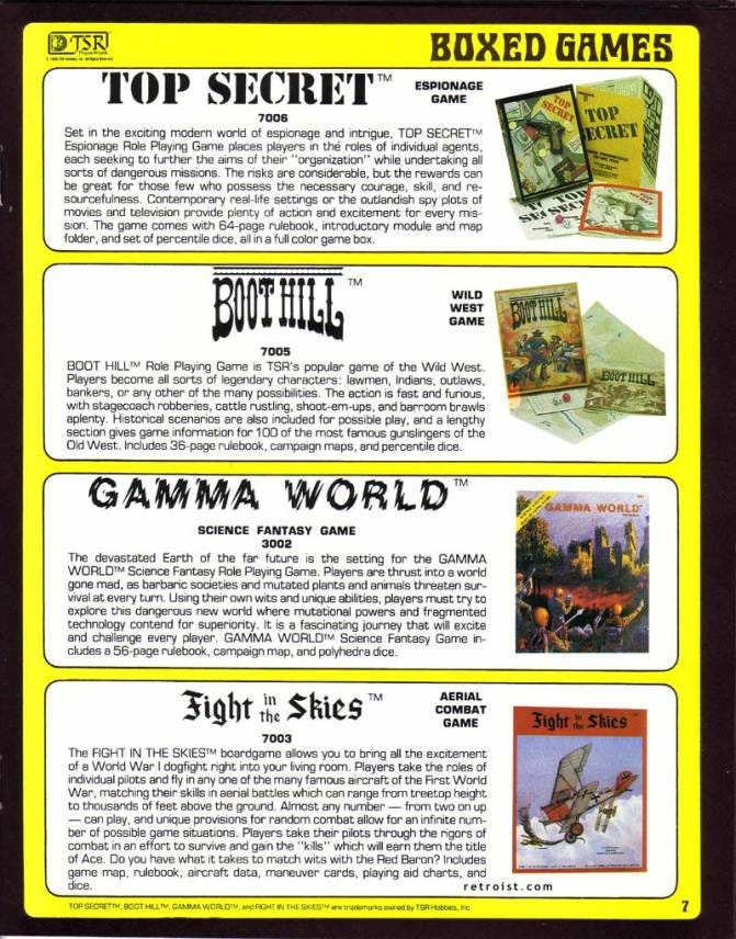 I played a lot of Top Secret and Gamma World. We played Boot Hill briefly, but eventually switch to another old west system called Desperado. I don’t remember why. Never played Fight in the Skies, but my friends and I made up an RPG system based on WWI aerial combat. Not a ton of opportunity for role-playing, but we had a lot of fun with our d6 based combat.