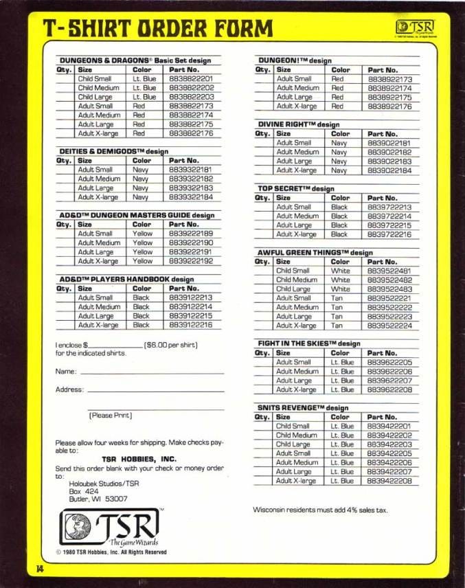 Here is the order form for the shirts. 6 bucks a shirt! Including shipping! What a bargain. That would be $15.10 nowadays, which would still be worth it.