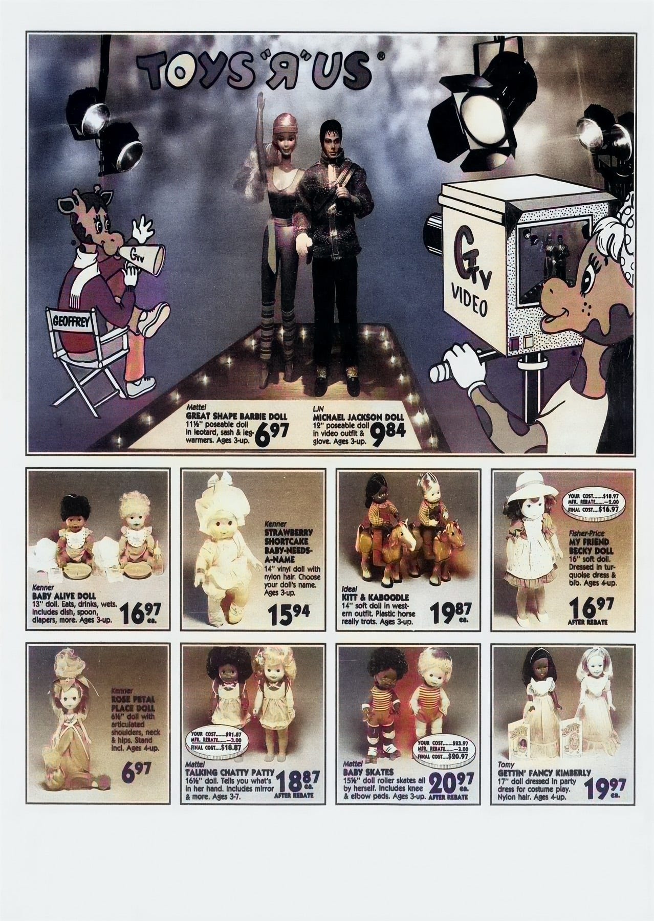 The real star of the page isn’t the toys though, its Gtv. Geoffrey directing a music video or some sort of performance where Michael Jackson and Great Shape Barbie take the stage together, it doesn’t get much more 1984 than that.