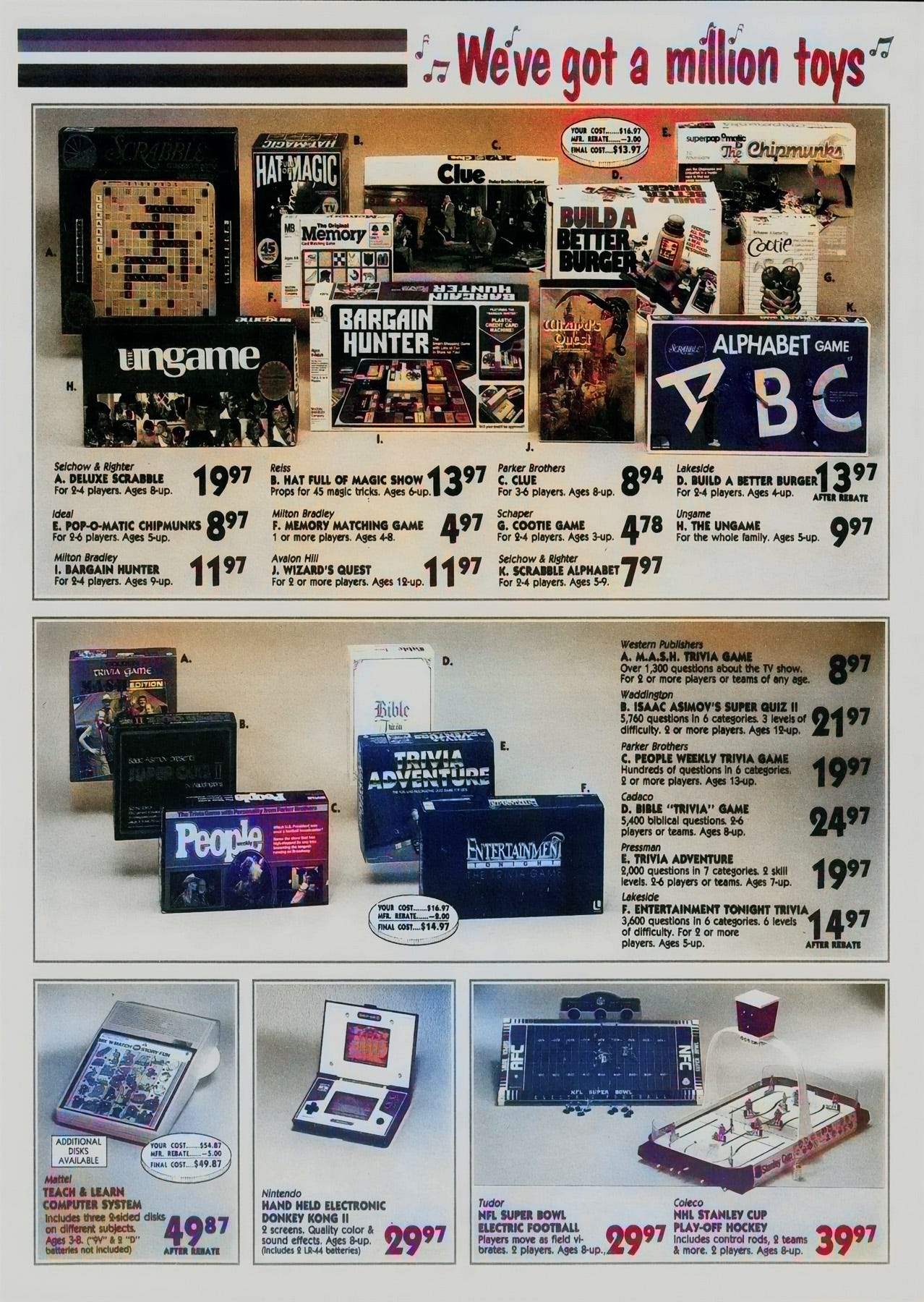 I look at this page and see two things I wanted and remember asking for. The Handheld 2 screen Electronic Donkey Kong II and Wizard’s Quest by Avalon Hill. What I did get was the Entertainment Tonight Trivia Game. Not sure why, but later on I was also given the People Weekly Trivia Game. I liked trivia, but I didn’t ask for either of them.