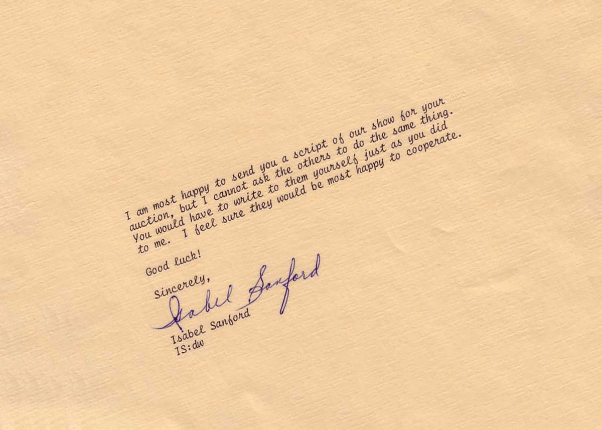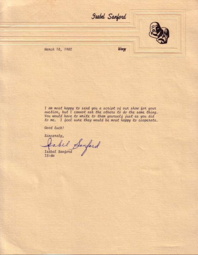 Because “The Jeffersons” kick butt, and if you watched it, you could tell that Sanford was the classy type of lady who you knew you could count on in a pinch. About a week after receiving this, the script was sent. The auction was a success by grammar school standards, and my respect for Sanford shot up even higher (To Bea Arthur levels).