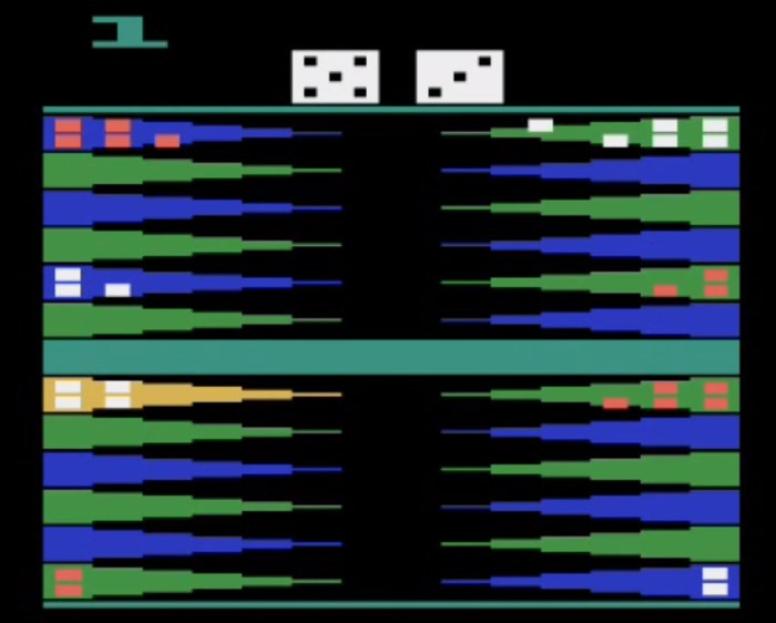 As you can see the board looks great. It is colorful and looks like a Backgammon board. The dice, which you see at the top of the screen, also look like proper dice. Sound, as you might guess for a 1979 title, is extremely underwhelming. Still, the game moves at a good enough speed that anything more engaging than the occasional blip, would probably become distracting.