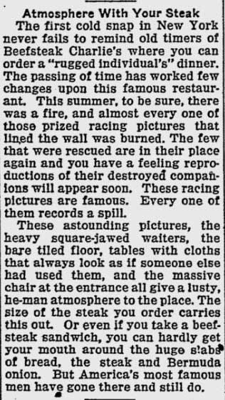 In 1910, Charles W. Chessar, a New York City restaurateur, opened a restaurant. He would name his restaurant after a nickname that was given to a local newspaper sports editor, Beefsteak Charlie. In 1922, a steak that covered the plate would cost you fifty cents, and you didn’t need to worry about making a mess. It was the type of place with a sawdust-covered floor and racetrack pictures on the walls.