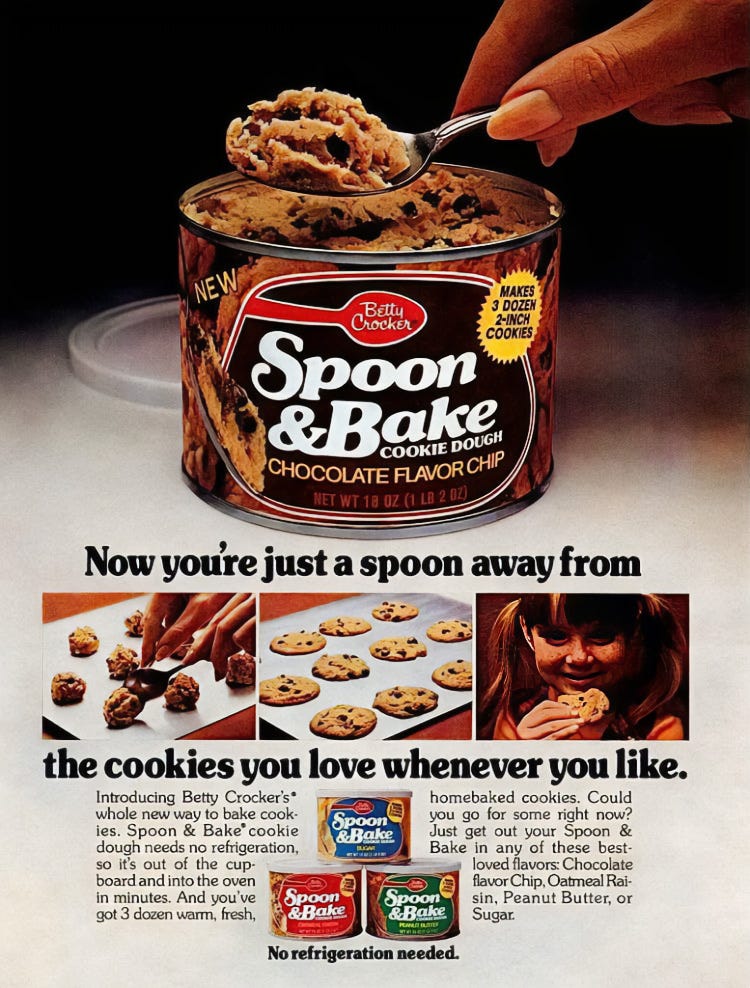 Unfortunately, while many people remember the product, not a lot of information about it is available. Here is what we know. It found its way on to store shelves in March of 1975. A can would run you about 99 cents and contained 18 ounces (0.68 kg) of shelf-stable cookie dough. While chocolate chip appeared to be the most popular flavor, they also offered Peanut Butter, Sugar, and Oatmeal Raisin.