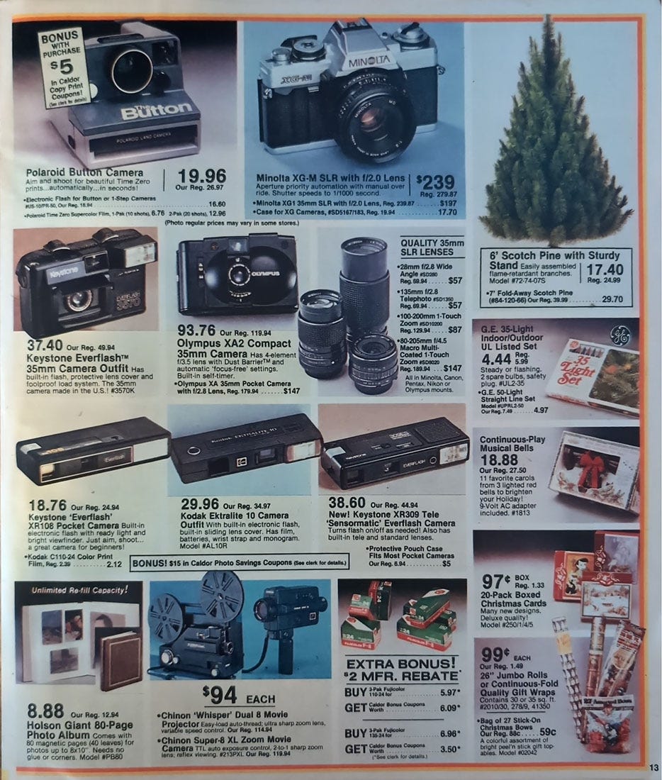 Some Christmas on the edge of the camera page. I would eventually get a 110 camera like the ones pictured here. I begged for one but didn’t think much about how much the film and development would cost. I love the branding on The Button by Polaroid. You’ll probably want that electronic flash upgrade.