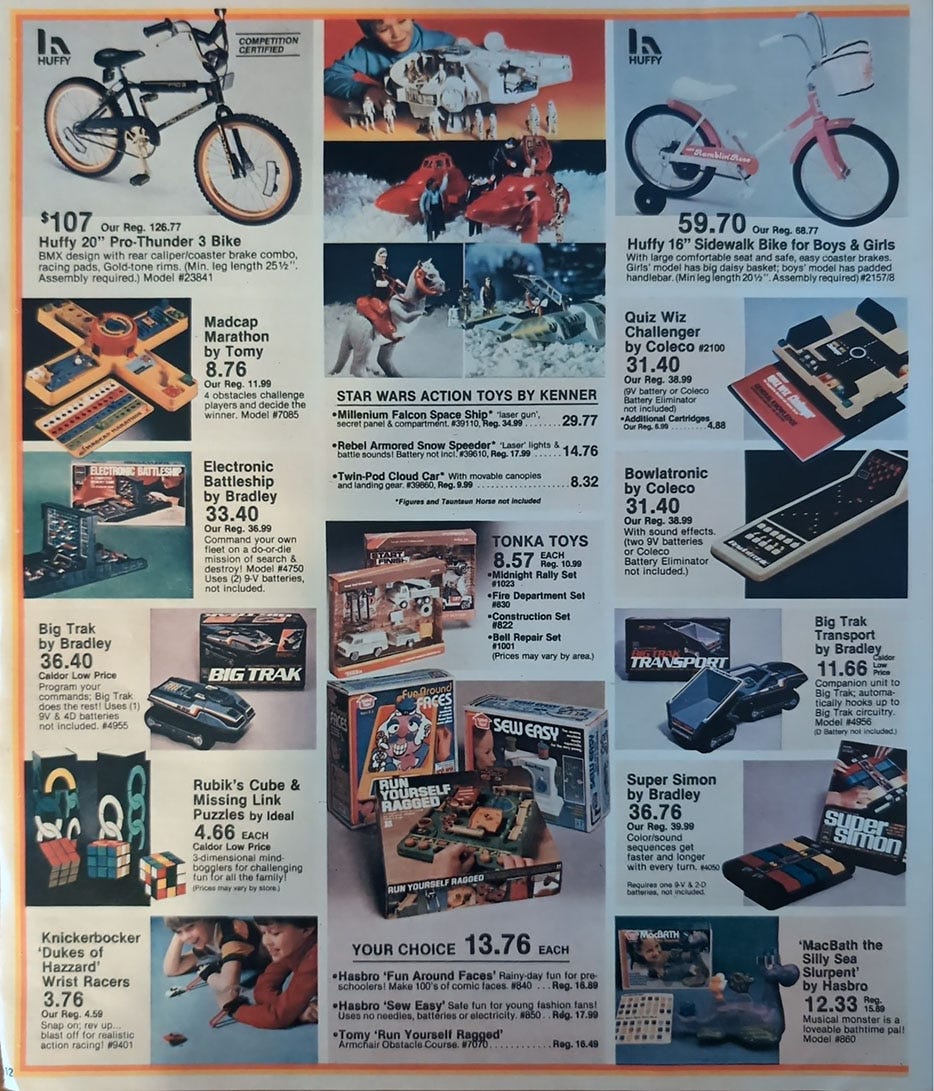 Now we are talking! They only have one page of toys, but it’s a good one. Just the Empire Strikes Back toys are worth checking out, but you have so many others. The Big Trak and Big Trak Transport, Rubik’s Missing Link, MacBath the Silly Sea Serpent, and Quiz Wiz! I would have been happy with anything on this page.