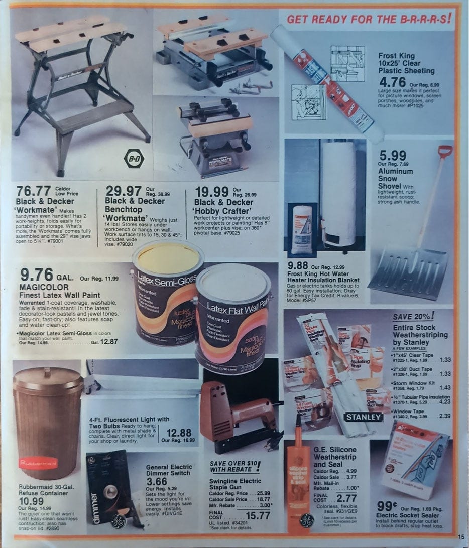 Home improvement stuff. Nothing too exciting, although in the 1980s you really started to see all-metal trashcans finally completely replaced with plastic ones like that Rubbermaid 30-gallon one.