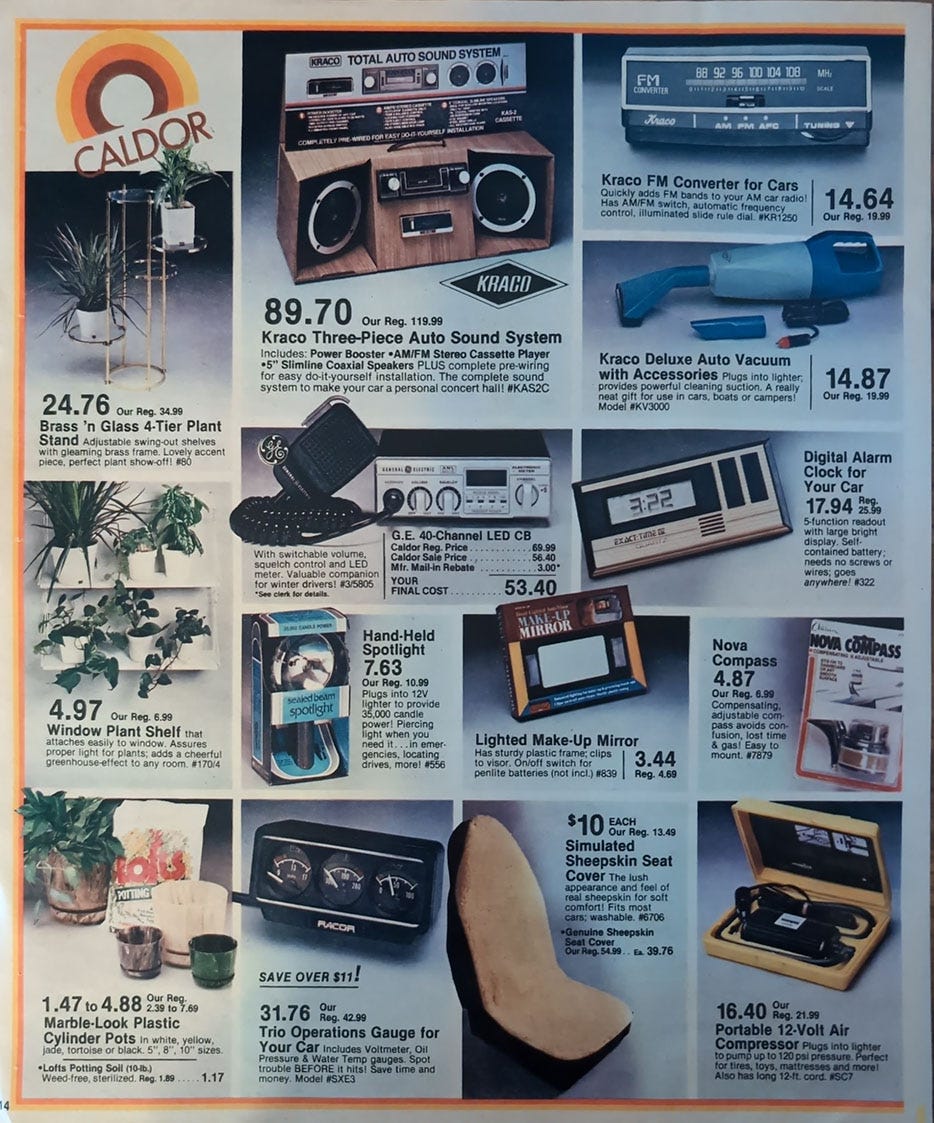 Nice to see a CB radio here. We were still in a time when people wanted them in their cars. But what I really wanted to point out was the Brass ‘n Glass 4-Tier Plant Stand. My mom was obsessed with getting one of these, and one year for Christmas, she got one as a gift from my sisters and me. She kept it until the thing was wobbly, and one of the glass panels had broken.