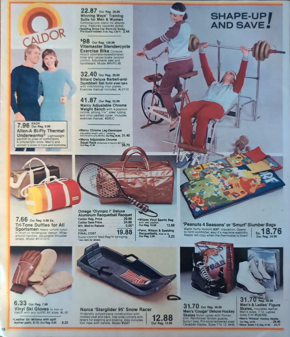 Tri-Tone Duffle bags are 🔥, but I can’t stop focusing on the placement in the upper right side of the page. The exercise bike and sleeping bags are really crowding the weight bench. Did they plan on grabbing some sleep in their Smurf sacks after their workout? And of course, Racquetball, because it’s the early 80s.