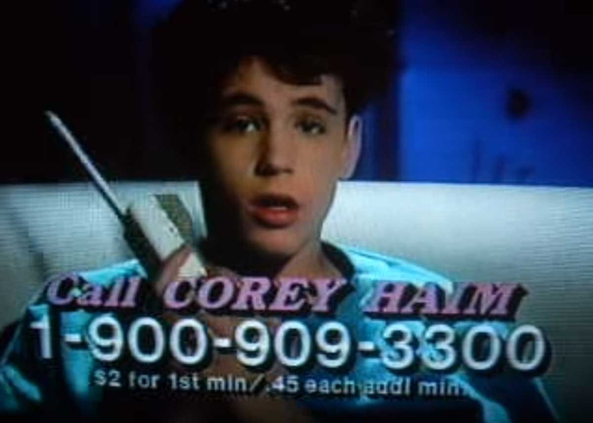This week I stumbled upon wonderful commercial for the Corey Haim Hotline. Fan of Haim? Just dial 1-900-909-3300 and for just $2 the first minute and 45 cents each additional minute, you could hear all the inside dope on Corey. Which from this commercial seems to rotate primarily around his kissing ability. Which, surprise, is pretty amazing.