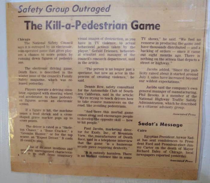 Death Race was controversial because it appeared to promote vehicular violence. Even though Exidy took great pains to describe the human stick figures you are running over a “gremlins”, people were not buying it. The media lashed out. It did not help that the game’s working title was Pedestrian and appeared to be inspired by the 1975 cult film Death Race 2000.