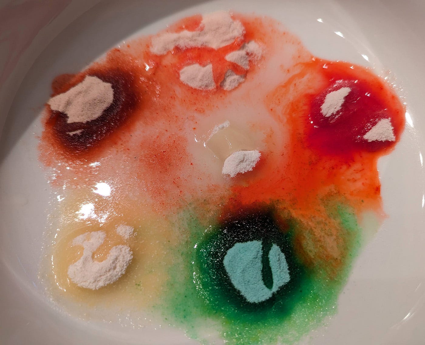 Opening them up and putting them on a white background, you can see that not only did they stay in powdered form, but they also retained their color. Impressive. I am almost tempted to taste them.