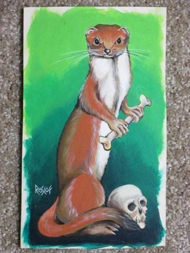 The art on this card was by Jim Roslof. Roslof’s Weasel is a sleek elegant animal. Cute, but with a stern hint of intelligence that makes it appear dangerous. If you had any doubt about that, just peep the skull at his feet and the bone that the Weasel is holding. It means trouble.