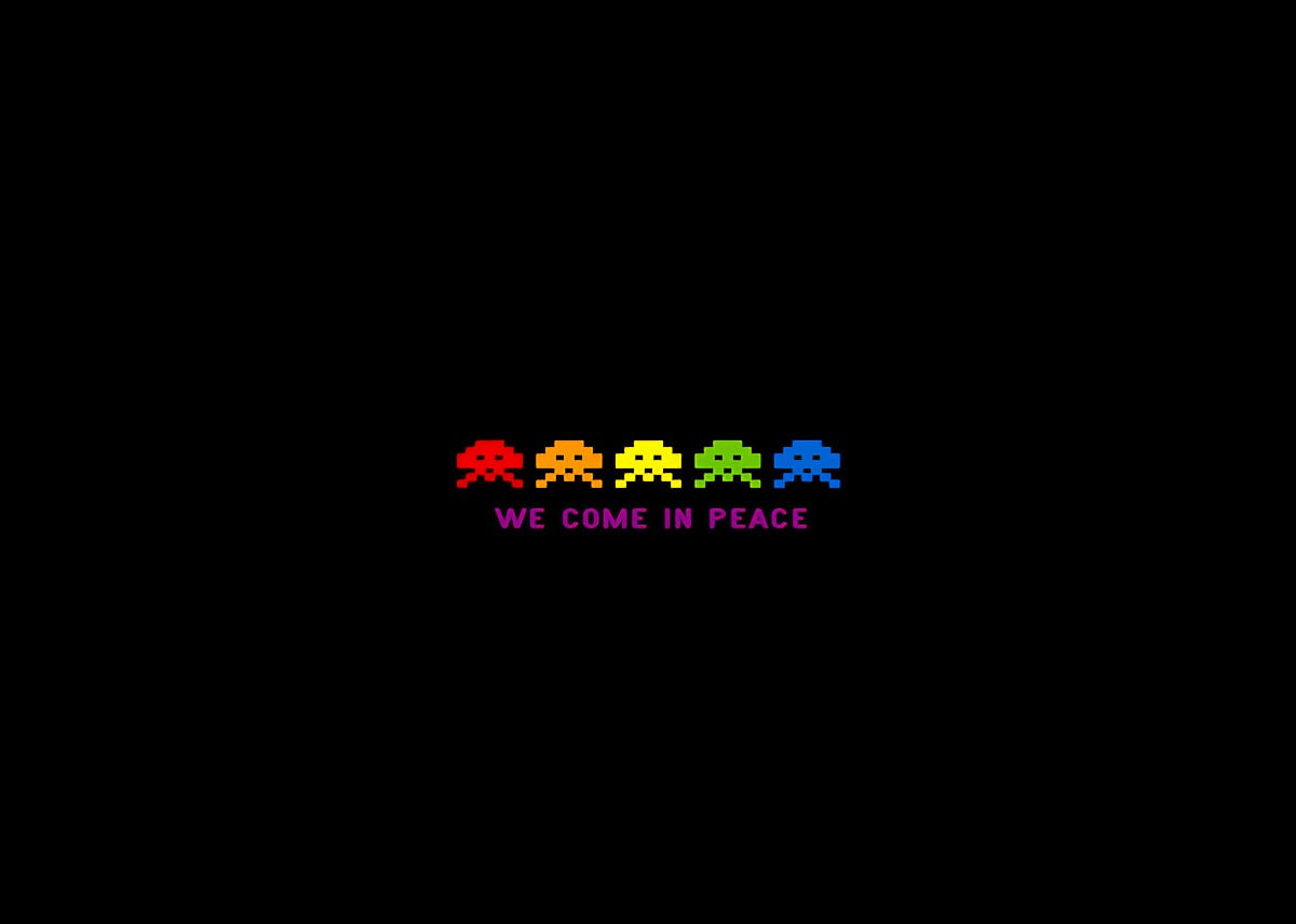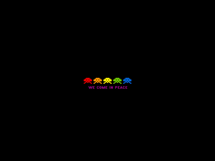 A few years ago, when I used to post a lot more desktop wallpapers, I made a wallpaper that has since become very popular. It is a very simple wallpaper, with some very familiar pixelated space monster in bright colors. The message in the wallpaper is simple, “We Come in Peace.”