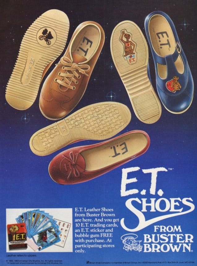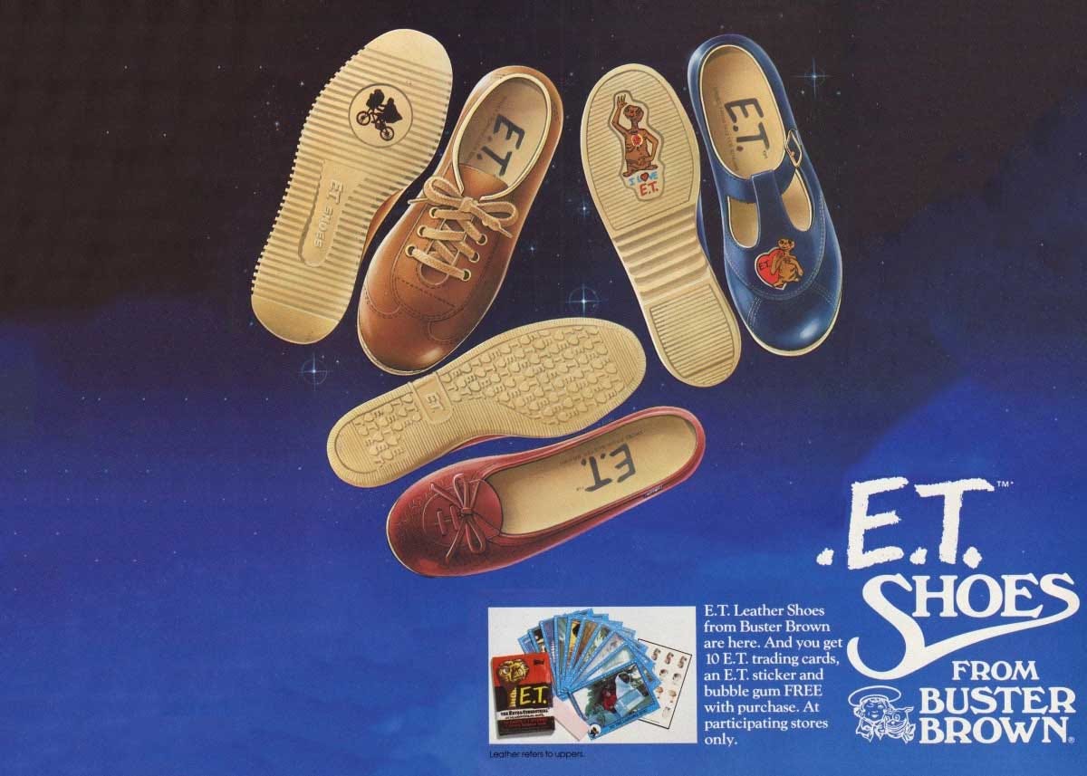 Buster Brown was the one company that could get me excited to go shopping for new shoes. Not only did they offer swell Care Bear themed shoes, but they also had ET Shoes. I must have begged for these shoes plus a bunch of other E.T.-related clothing and toys for months. Sadly, I never did get a pair. So while I might have looked snappy in my swell E.T. t-shirt and belt, my shoe remained woefully plain.