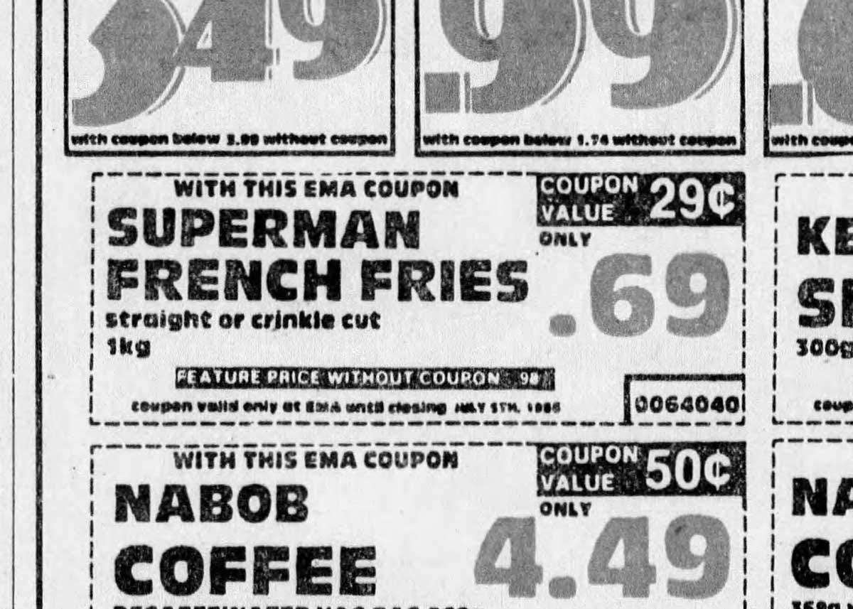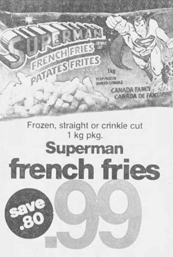 Canadian food maker Canadian Fancy acquired the exclusive rights to produce the Superman French Fry line, and I remember them fondly. These were not widely available but could be seen from time to time in specialty SUPERmarkets (Pun Intended).