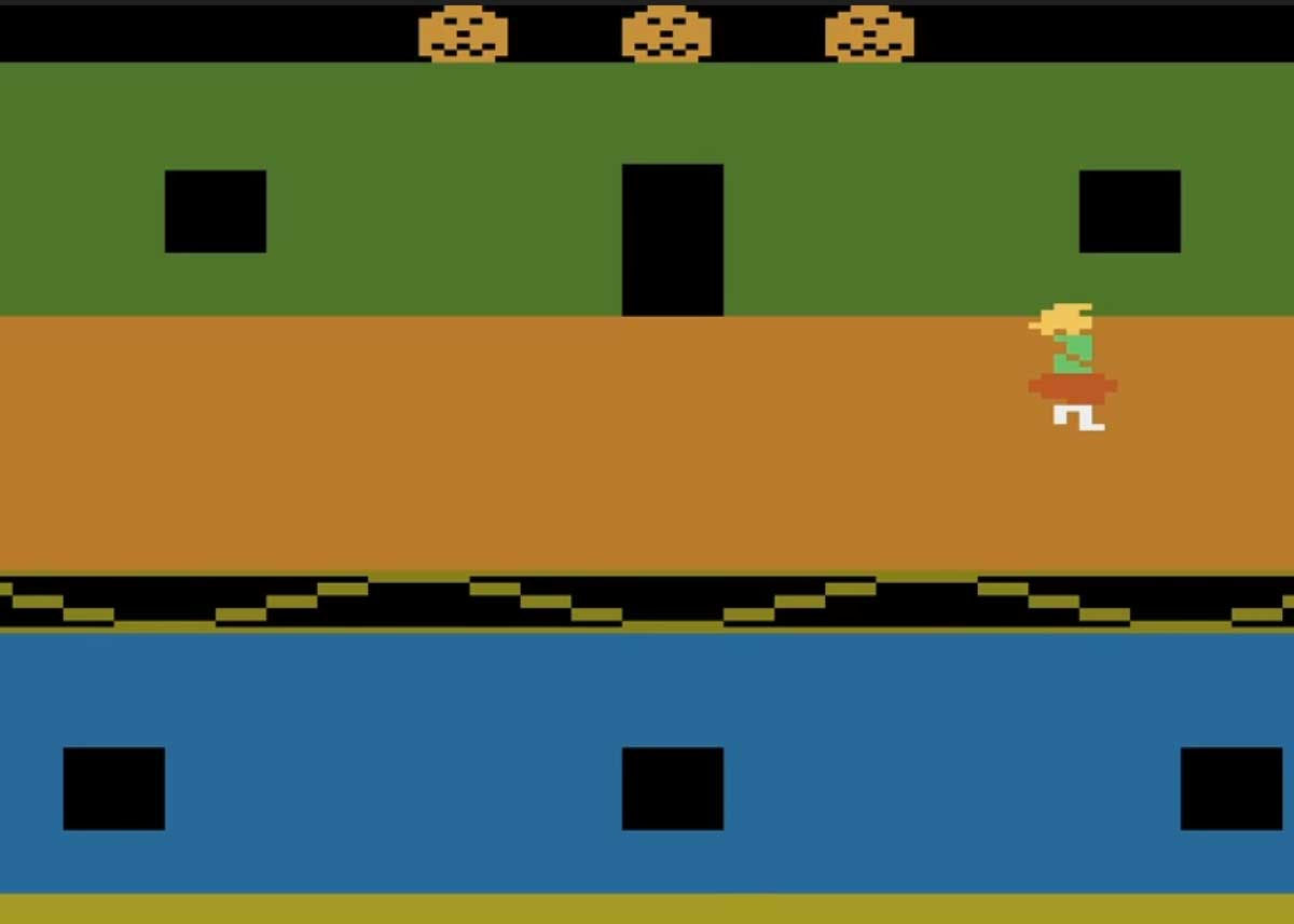 I wish I had played this game earlier, because it is great! You take the role of the Babysitter in the infamous Halloween universe, and you need to rescue your charges while at the same time avoiding the deadly knife of the killer Michael Myers. Myers looks great in his VCS 8-bit form, and they really tap into the feeling of the movie, having Myers appear at random times and always accompanied by that great Halloween music. He is slow and predictable, but deadly. So you need to time your dodges perfectly as you try to keep ahead of him or get around him. While doing this, you may stumble across a knife. You can pick this up as a one use item. Stab Myers, and he flees temporarily. Then the knife will be reseeded into the game world.