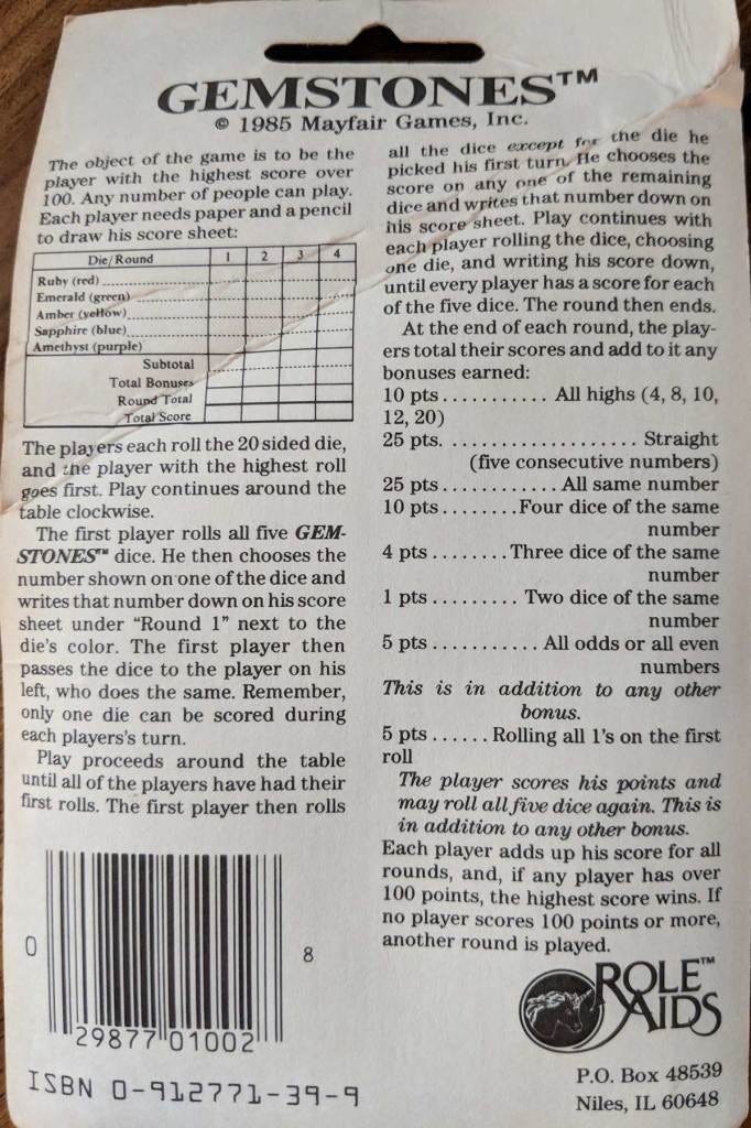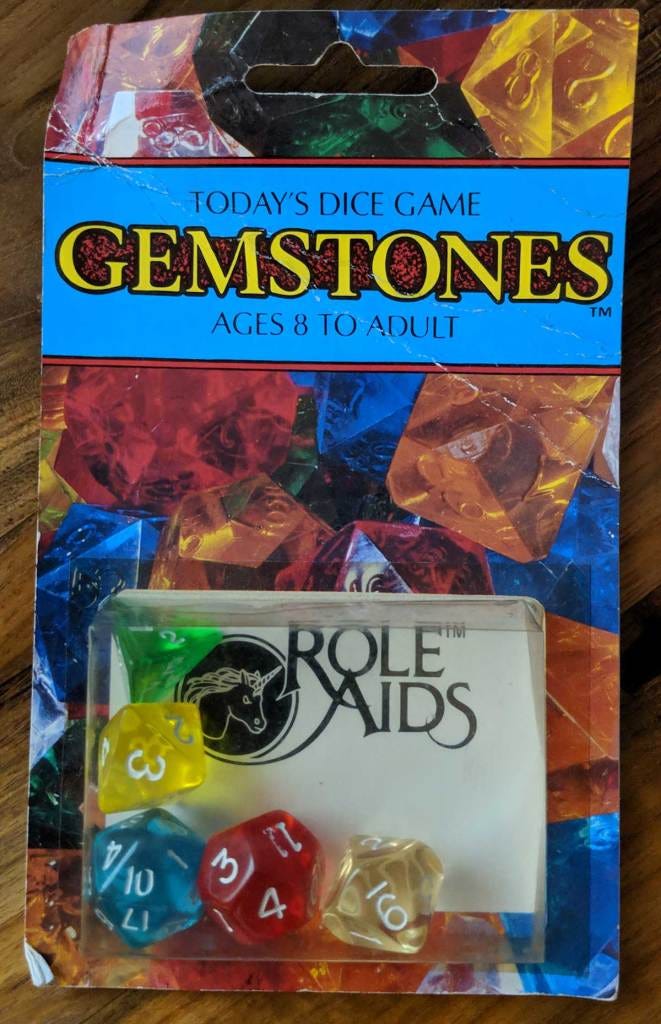 Back in the 1980s, I remembered by a set of dice from Mayfair Games and Role Aids that featured a game that used a standard set of RPG dice and little else. For years I had been trying to remember what they were called. Then a few weeks ago, it hit me, Gemstones. A few bids later and I was in possession of an original package of Gemstones. Complete with Dice and rules.