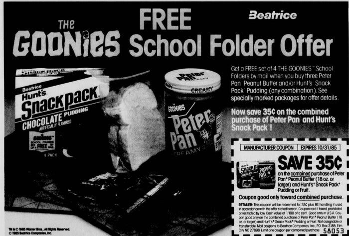 Finally, I wanted to leave with one last Hunt’s pudding memory, and it’s a good one. In 1985, as a tie-in with The Goonies, Hunt’s offered a Goonies School Folder offer with the purchase of Hunt’s Snack Packs and or Peter Pan Peanut Butter.