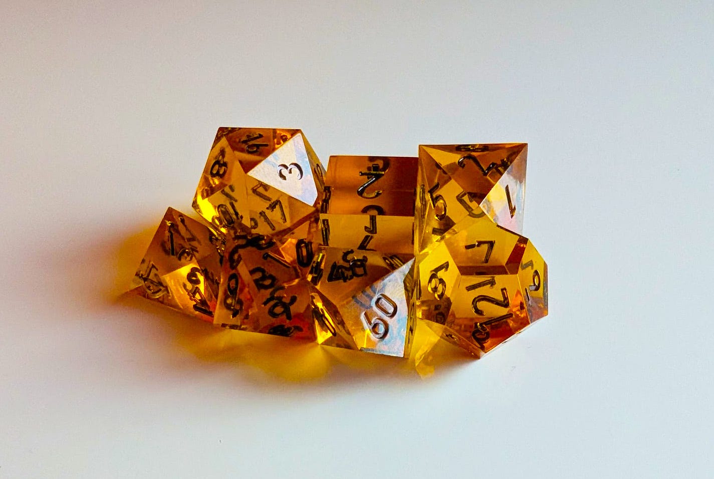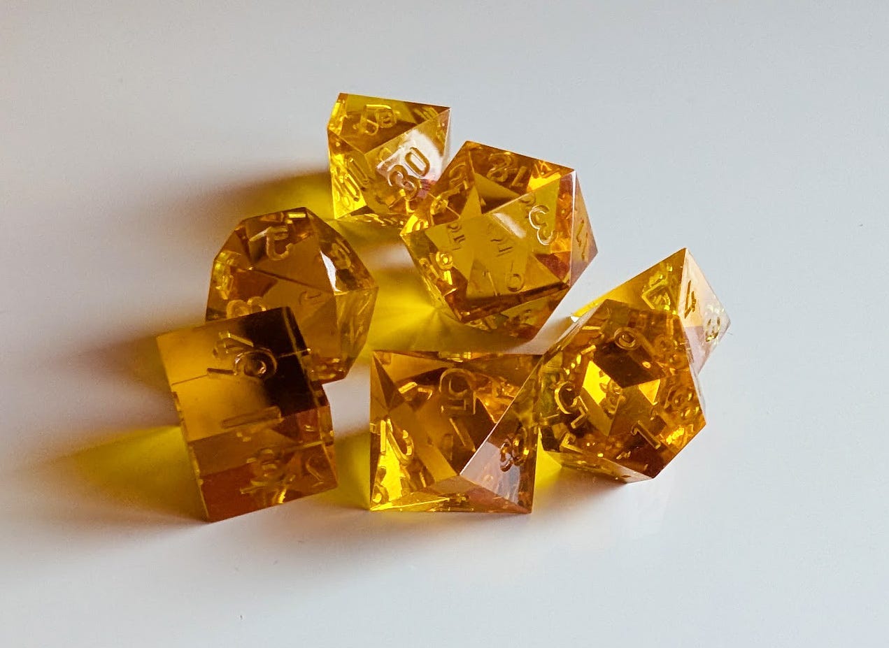 When I started playing D&D, I was invited to join an existing group at a friend’s house. His older brother played with us as a very clever mage. While I was impressed with his roleplaying skills, I was more taken with a set of dice he had. It was a dark yellow gemstone set from the company The Armory. I was smitten. Every time we played I found myself staring at them, wishing I had a set just like it. When I went to store to see if I could find them? No dice.