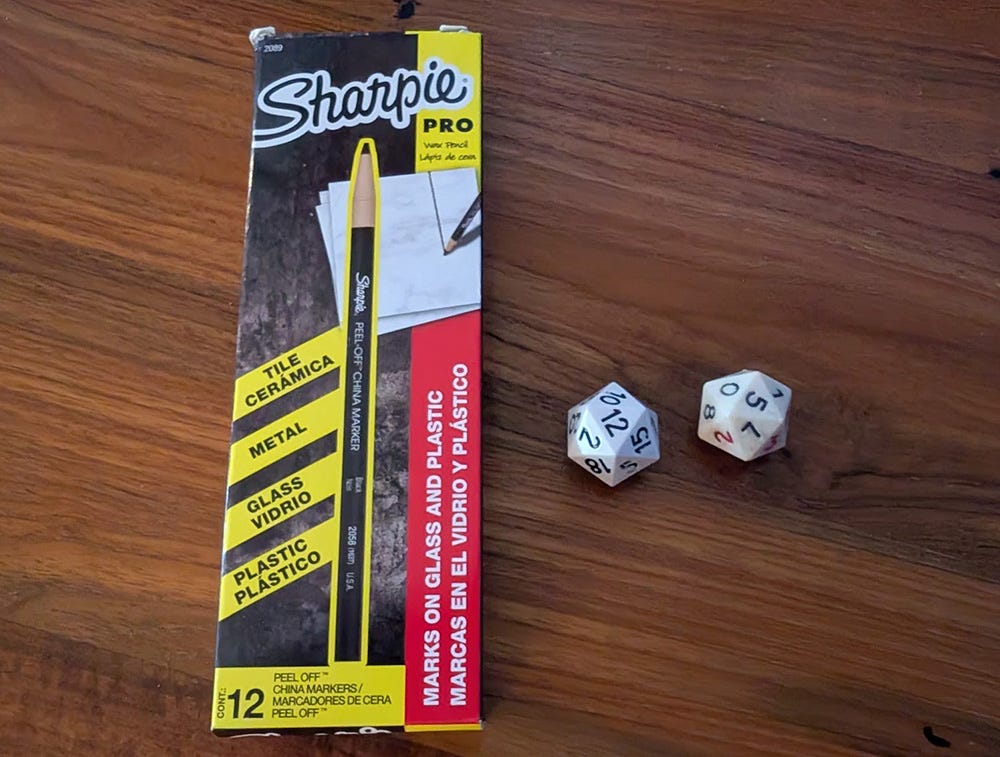 It was suggested to me that a grease pencil might be a good way to ink dice, so I orders some Sharpie brand ones off Amazon and gave them a try. The results were solid. The results were similar to what I get when I use a crayon, but the pigment laid down more easily. Wiping off required just a small amount of extra work, but I will definitely be trying it out more often on future dice.