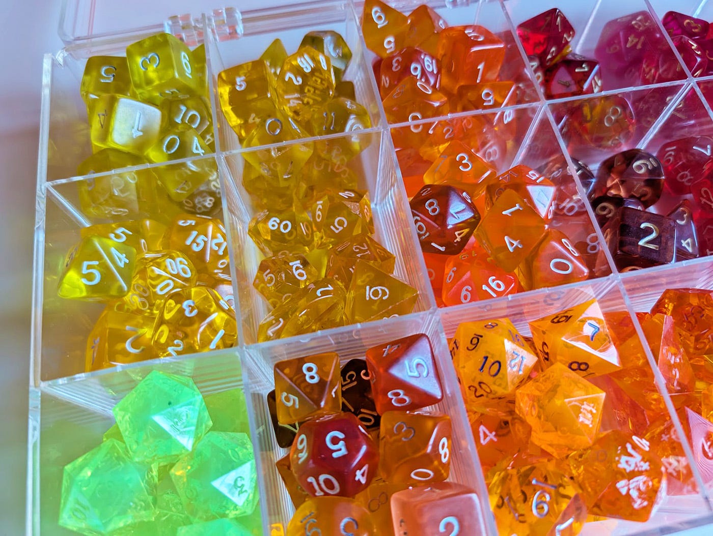 As I moved from opaque to gemstone-style dice, I continued using a crayon. I even picked up a set of what were billed as "Dice Markers" but were actually just thick crayons. For years, the RPG store I visited had a case filled with shiny and glittering dice just waiting to be enhanced. Then one day, I went there, and they were selling sets of dice with the numbers already colored in. These dice were sold in sets, had rounded edges, and came in a rainbow of colors. We were smitten, quickly picking up sets in our favorite colors.