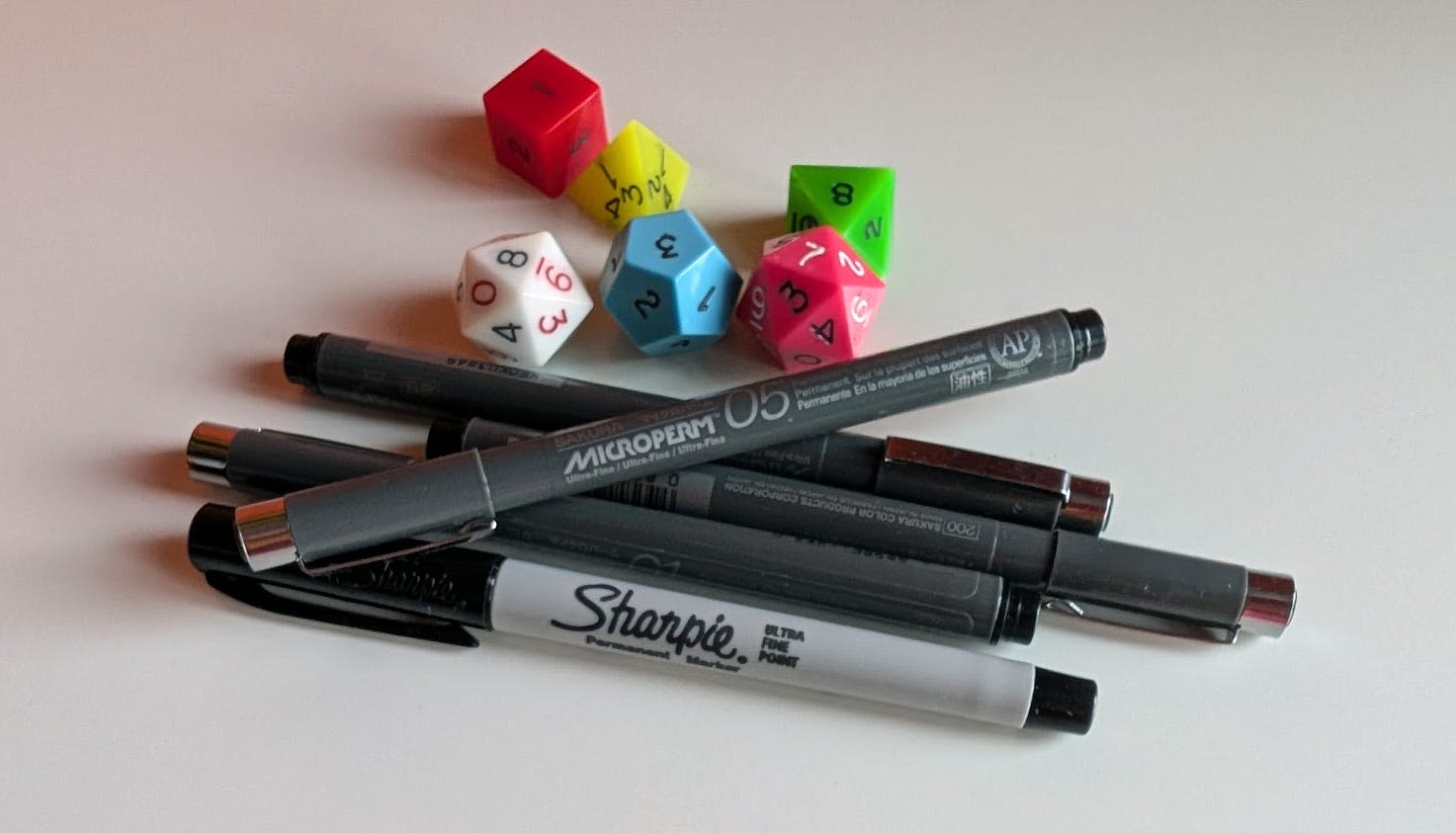 Then you need to start inking. Before you do, you will need to choose a color, grab a marker, and have a steady hand. I suggest considering the contrast when picking the ink color. If you have a light-colored die, using a light ink can make it difficult to see. On the other hand, if you choose a dark color on a light-colored gemstone-style die, it can dull its luster, darken it, or even make it look muddy. You might also be limited by the markers you can find. You will most likely want an ultra-fine point. If you can’t find a satisfactory one, you can use a thicker-pointed Sharpie, but you will need to wipe away excess ink while it is still wet. Be very cautious with this; you can easily damage a set of dice using this method.