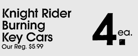 No way I saw this mind-blowing as a kid. It looks like the type of commercial that was put together by people who had never seen Knight Rider but imagined an end product that was so much more intense than the real thing. With words like Fearsome, awesome, and unmerciful mixed with a sort of real version of the Knight Rider theme. It makes you wonder what small child could resist this sleek black toy car? It also makes it obvious that I never saw this bit of advertising. If I had, I would own this Key Car. Especially since on sale they were as low as 4 dollars in 1984.
