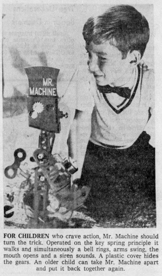 The marketing went well beyond the television advertising. Papers across the country would include Mr. Machine in their buying guide for Christmas that year. In this caption and photo from the time explaining the concept, we learn that while young kids can enjoy Mr. Machine, older kids can take him apart. So fun for all ages! My favorite of the buyers guides of the era described the toy as a “rolling mass of bolts.”