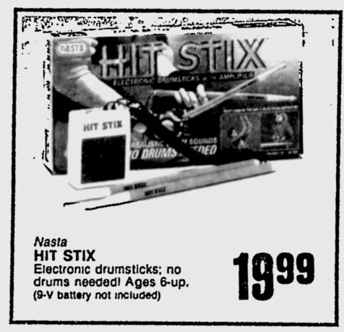 Their ability to be played in the air is what made them so interesting, it also turned out to be a problem for Hit Stix. Playing drums is a very natural motion, and most kids couldn’t help but try to play them as real drums. This resulted in either frustration because they refused to make the sound they wanted, or in damage to the actual Hit Stix.