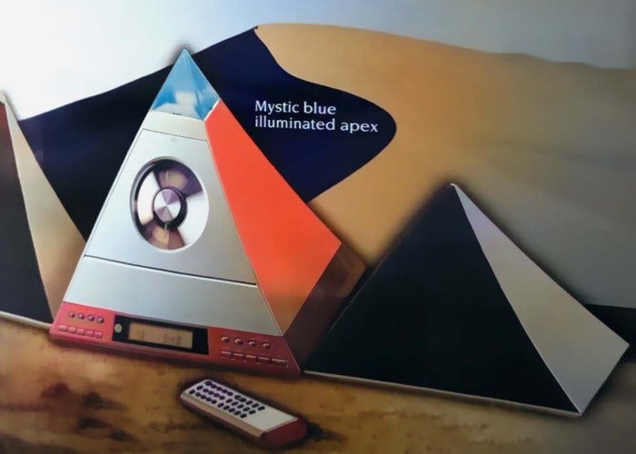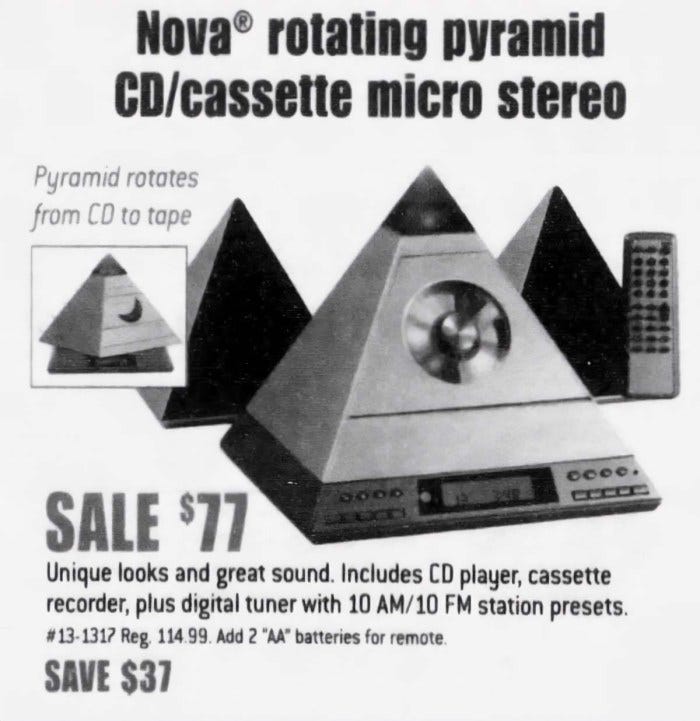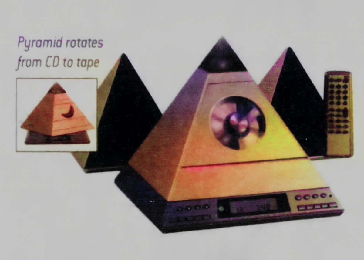 When stereos were starting to disappear from people's living rooms, Radio Shack took a wild swing by releasing a rotating stereo in the shape of a pyramid.