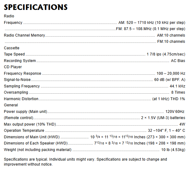 In addition to the CD Player and cassette, the Pyramid has a digital tuner with 10 AM and 10 PM station presets, a clock with sleep function, bass boost, 3 EQ presets (rock, classic or pop), and a remote control that requires 2 AA batteries.
