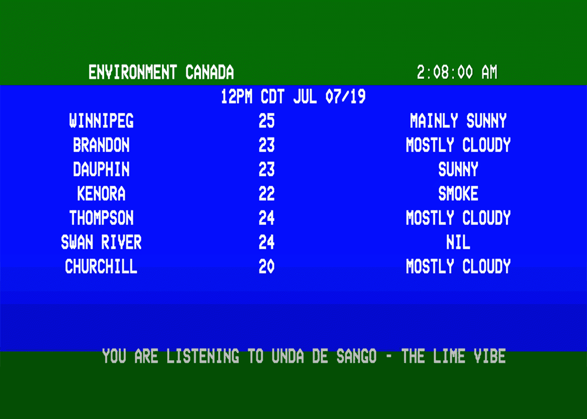 Well, I am happy to say that the above image does not come from an old broadcast, but is instead the product of a brilliant modern creation by Brandon Martel and Craig Midwinter. They launched a page on Facebook called the Weather Channel Winnipeg. Which is a recreation of the old-style weather channels from the early days of cable television. The nostalgia seems to be registering with a few thousand people in Manitoba, but I think people from outside that area will get a kick out of it as well.
