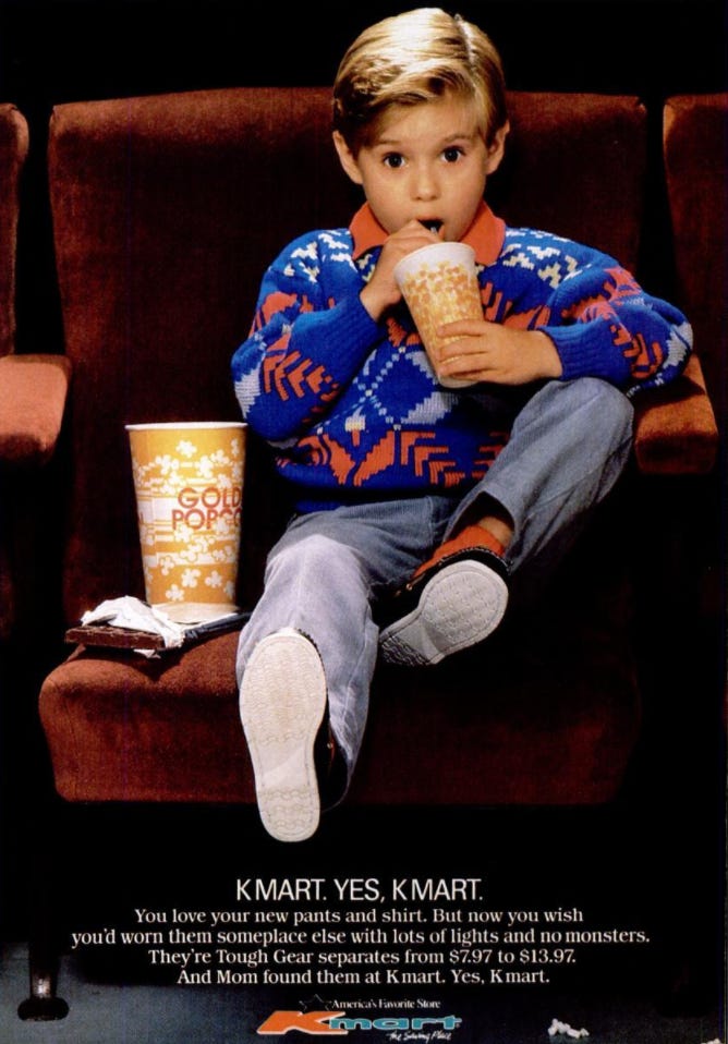 Here is another ad for Kmart, with a super cool well-dressed kid in a movie theater enjoying a drink in a great large cup.