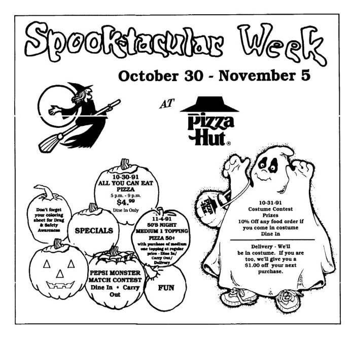 My favorite bit of custom advertising at the time has to be this Halloween ad from a Pizza Hut franchisee. The Halloween clip art is out in full force here and I love it.