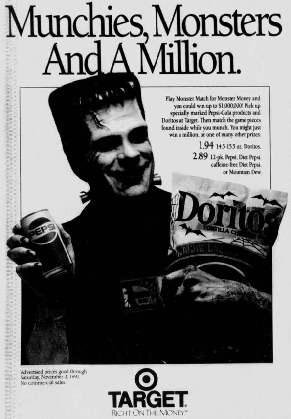 Even larger chains like Target were doing some “custom” advertising around the contest. In this ad, you get a pretty good shot of Frankenstein holding a spooky monster themed bag of Doritos and a game piece. I hope one Halloween, they decide to bring these bags back. They are amazing.