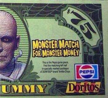It was one of the more unusual contests I ever followed along with and it was also terribly one-sided since I always paired my Doritos with Coca-Cola. So here is how the contest went, when you bought either Doritos or Pepsi, you would get a game piece that looked like half of a faux bill with one of the Universal Monster’s faces on it.