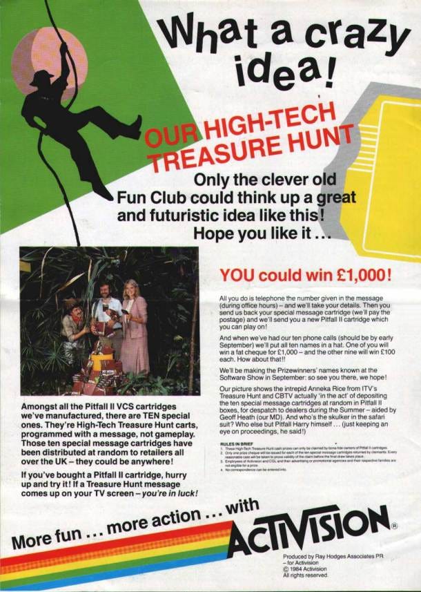 Here is the ad that the Activision fan club ran for the contest. I love the photo of the two people depositing the carts for finding while a mustachioed Pitfall Harry skulks behind them in the foliage. Those two people are Anneka Rice from ITV’s Treasure Hunt and Geoff Heath, who I think is the Marketing, Membership or Media Director for fan club?