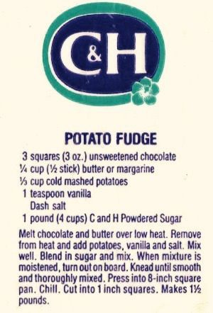 For those of you out there who are saying, “No, potato fudge is real, I have had it.” You are probably referring to the fudge that is made with mashed potatoes. You can find lots of recipes for it online. From what I understand, it tastes just like regular old fudge. It just has a slightly different consistency. Here is an ad for the fudge I found online from C&H.