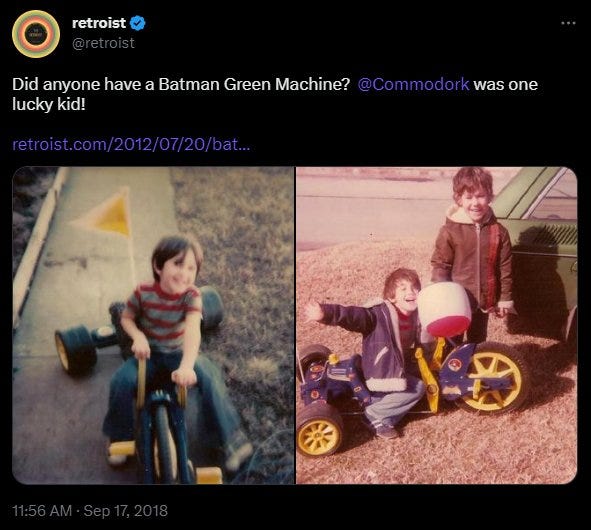 After writing about the Green Machine, I was reminded of a tweet by longtime Retroist contributor and podcaster, Rob O’Hara. When Rob was a kid, he had a Batman themed Green Machine. Needless to say, it looked amazing.