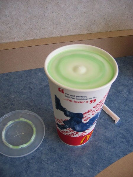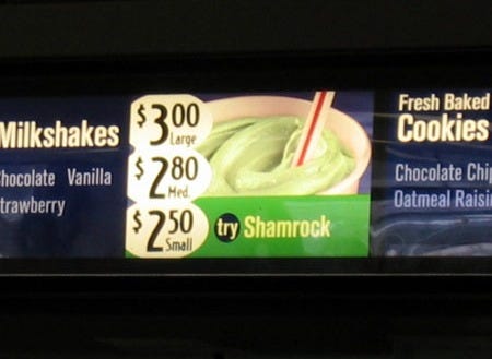 We have 4 McDonald’s in the immediate neighborhood, so the other day I walked to the closest one and found they don’t carry them. I was sad, but not surprised, and moved on to the next McDonald’s. I hit all 4 and got nothing. Now I remembered liking these minty shakes, and when the day began I was just “looking forward” to having one. But now that the universe sought to deny me that which I was rightfully entitled to consume, I NEEDED a Shamrock Shake. Which could only mean one thing. ROAD TRIP!
