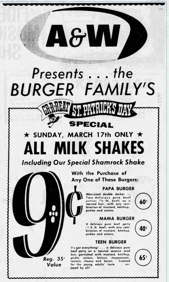 Pretty cool huh. They were not the first restaurant to serve a green milkshake during St. Patrick’s Day. In fact, quite a few places served shakes that they even called Shamrock Shakes. Here is an ad from March of 1968 for A&W where they mention their Special Shamrock Shake.