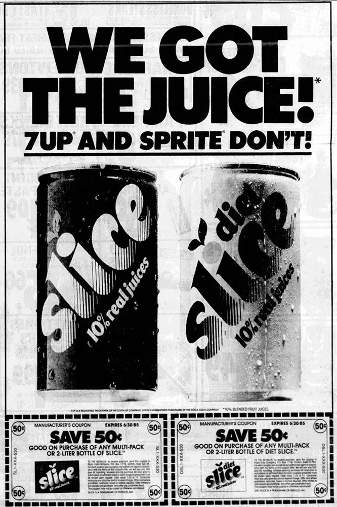 The timing turned out to be perfect. This was the mid eighties, when people were starting to glance at labels and notice ingredients, even if it had not changed many habits yet. The juice thing hit home. It made Slice appear healthier, even if it was still a soda loaded with sugar and sitting next to all the other sodas on the shelf. Perception helps move product, and Slice had it.