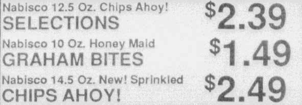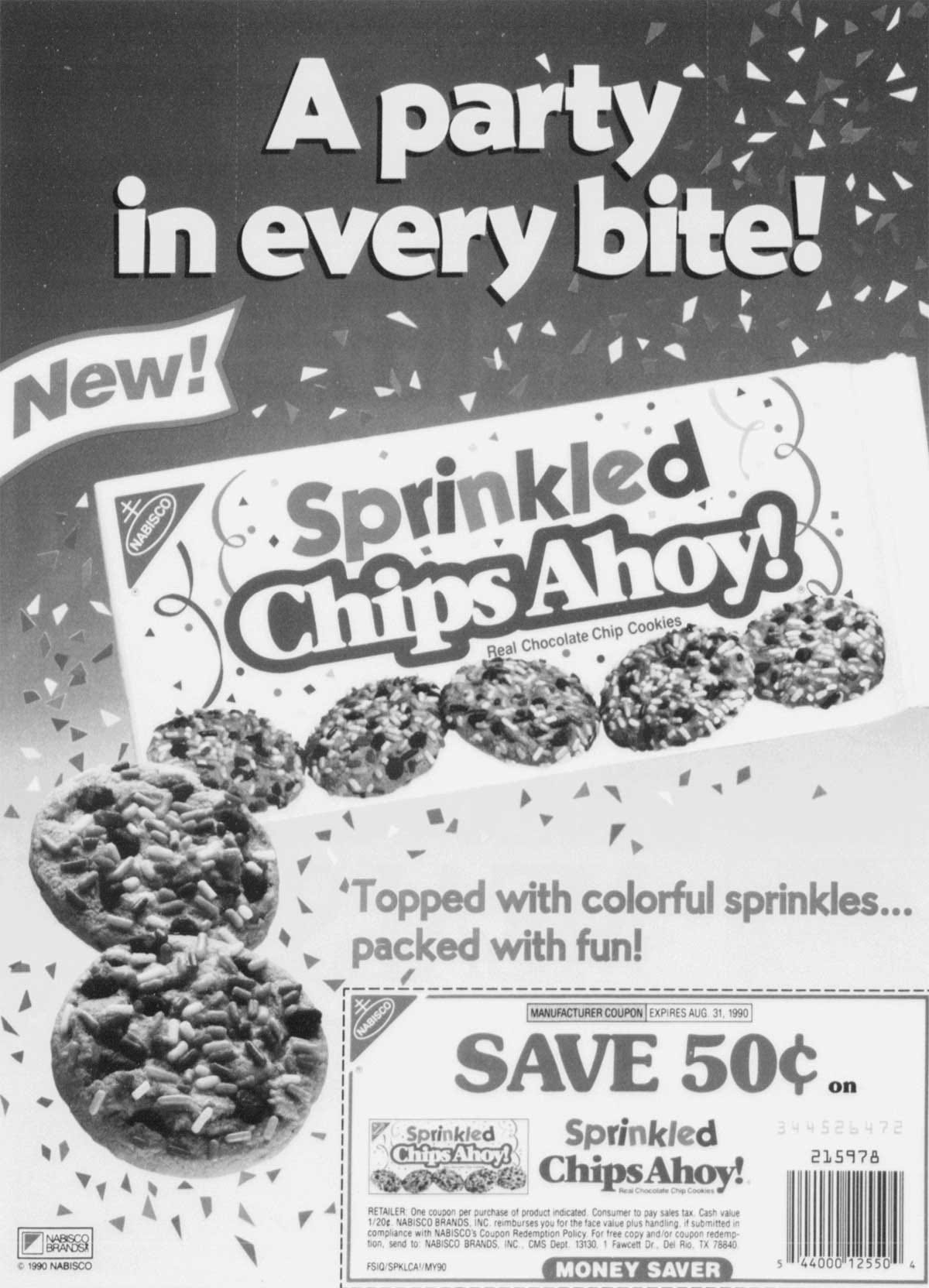 If that is a little too much for your budget, I found this 50 cent off coupon from a 1990 circular. This might be the very first manufacturer coupon for Sprinkled Chips Ahoy. Even in black & white, you can see the party aesthetic of their advertising and catch both of its apt slogans.