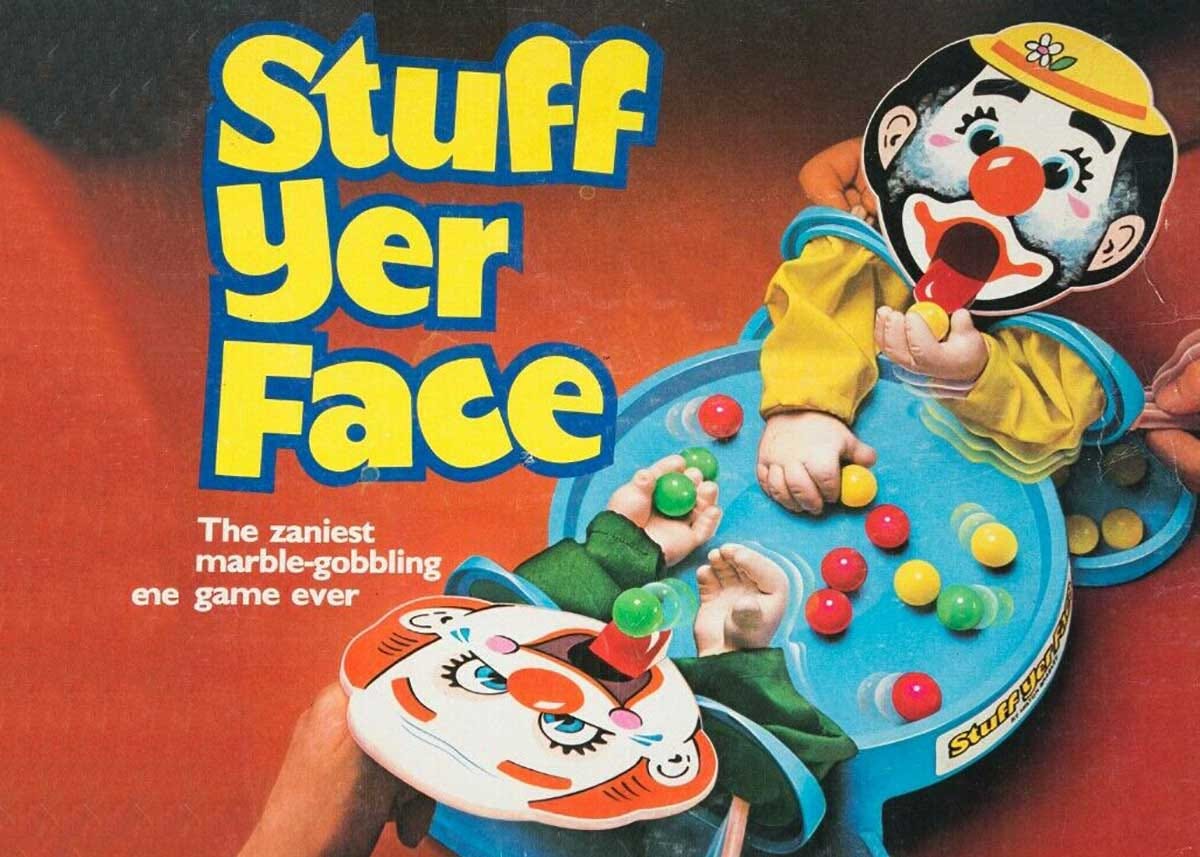 Introduced in 1982 by Milton Bradley, "Stuff Yer Face" emerged as a captivating tabletop game tailored for two players. The game board, reminiscent of a vibrant carnival setting, hosted a circular blue arena adorned with two whimsical clown puppets. Amidst this delightful setup, 25 marbles jostled for attention—ten yellow, ten green, and five red. The objective was straightforward: become the victor by having your clown puppet consume all ten marbles of your designated color.