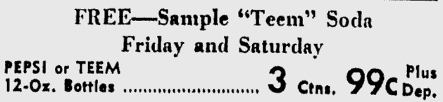 Teem was a lemon-lime-flavored soft drink produced by The Pepsi-Cola Company, introduced in 1960, it was Pepsi’s answer to 7 Up. While 1960 is the official launch date, the advertising campaign for Teem began in 1959, with samples being given out at supermarkets.