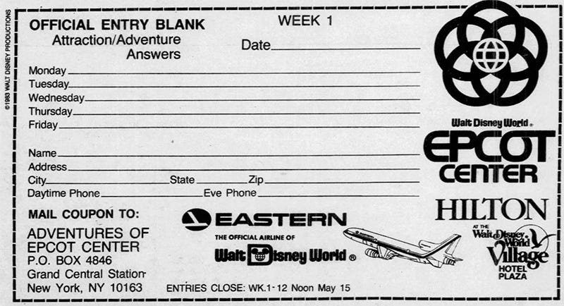 On the 6th, I got up, ran to the front door, and got the paper. It took me a few minutes, but I found the entry form and the details on how to enter the sweepstakes. It was easy. Every day of the week, they would give you an EPCOT-centric clue either in the Daily News or on WOR radio. Then you just put the clue into the official entry blanks and mail it in. You could enter as often as you liked, and no purchase was necessary. So I could take this entry blank, hand copy it, and send that in as well, which I did. Unfortunately, I wasn’t able to enter the contest under my own name since I was under 18, but I convinced my mom to let me put her name on it, and we were off to the races.