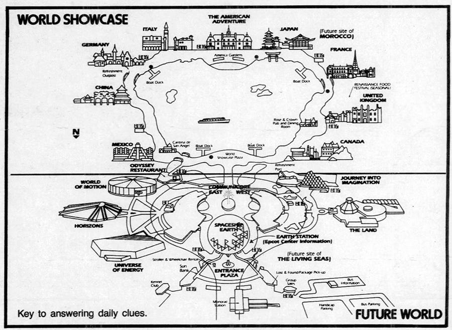 They included a map of EPCOT Center that they claimed you could use as a key to answer daily clues. Now, I hadn’t seen the clues yet, so I thought I would need to match something on the map or maybe solve some sort of puzzle and compare it to the map. Fortunately for me, it was a lot easier.